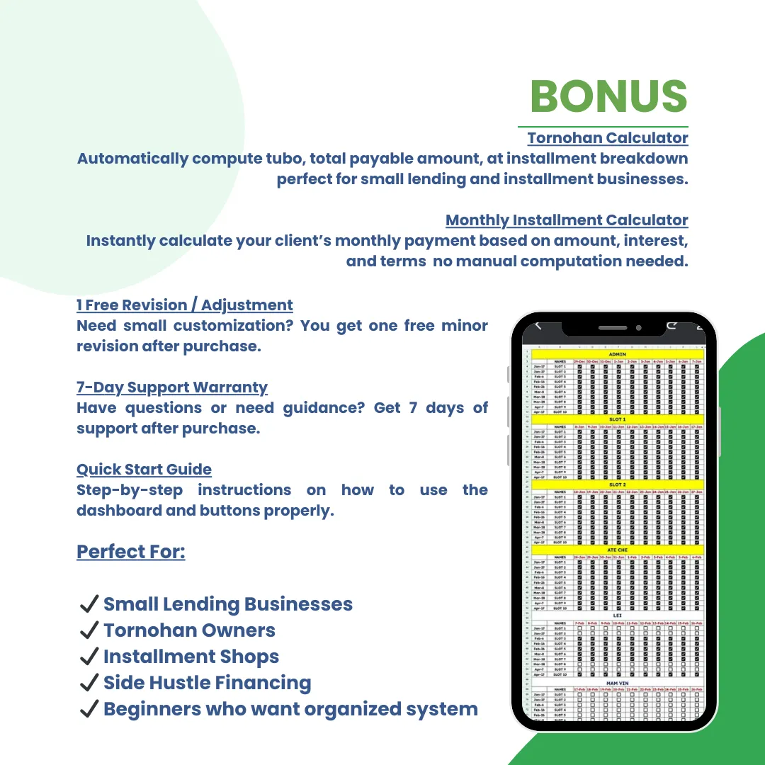 Perfect for small lending businesses, tornohan, and installment-based services.
